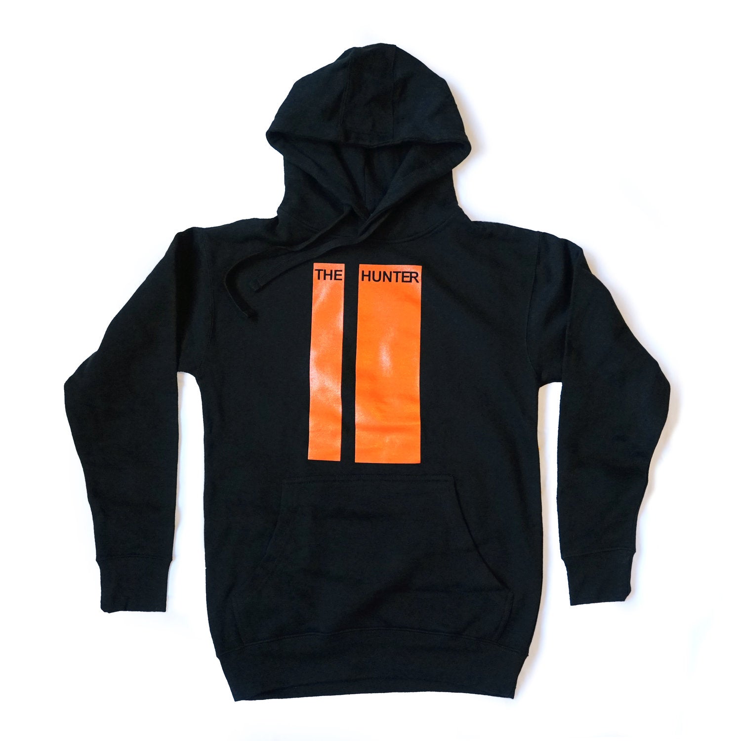 Black cotton hoodie with orange screen printing. "The Hunter" on the front, "The Hunted" on the back.